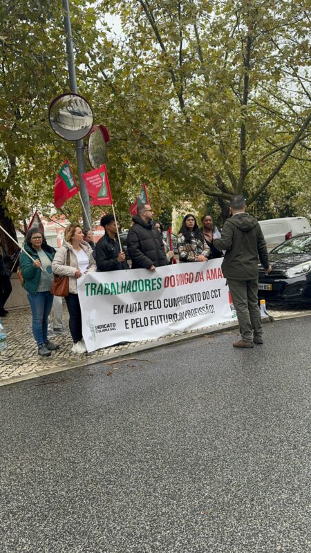 O Sindicato de Hotelaria do Sul informa que dezenas de trabalhadores do Bingo da Amadora se concentraram, nos dias 14 e 18 de novembro, junto à Secretaria de Estado do Turismo, exigindo esclarecimentos imediatos sobre o futuro da concessão da sala de bingo e a garantia dos seus postos de trabalho.