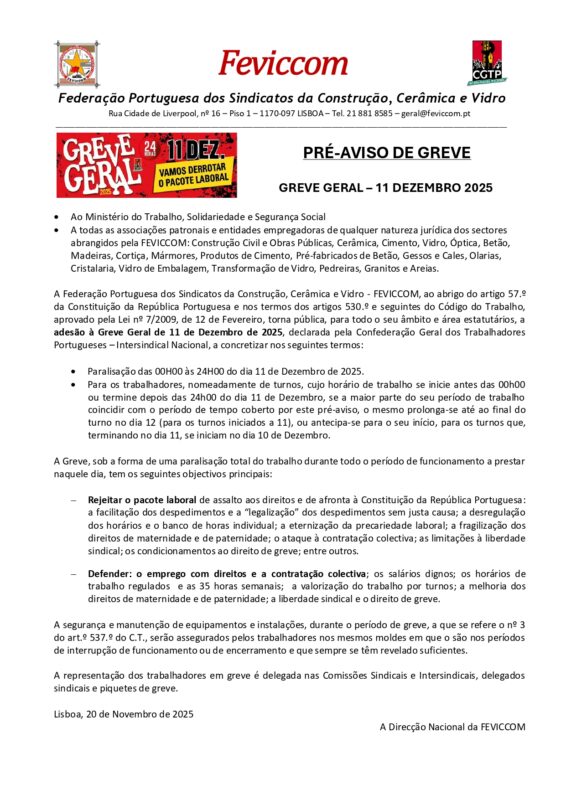 A FEVICCOM adere à GREVE GERAL da CGTP-IN e emitiu hoje o seu pré-aviso de greve para o sector! ✊